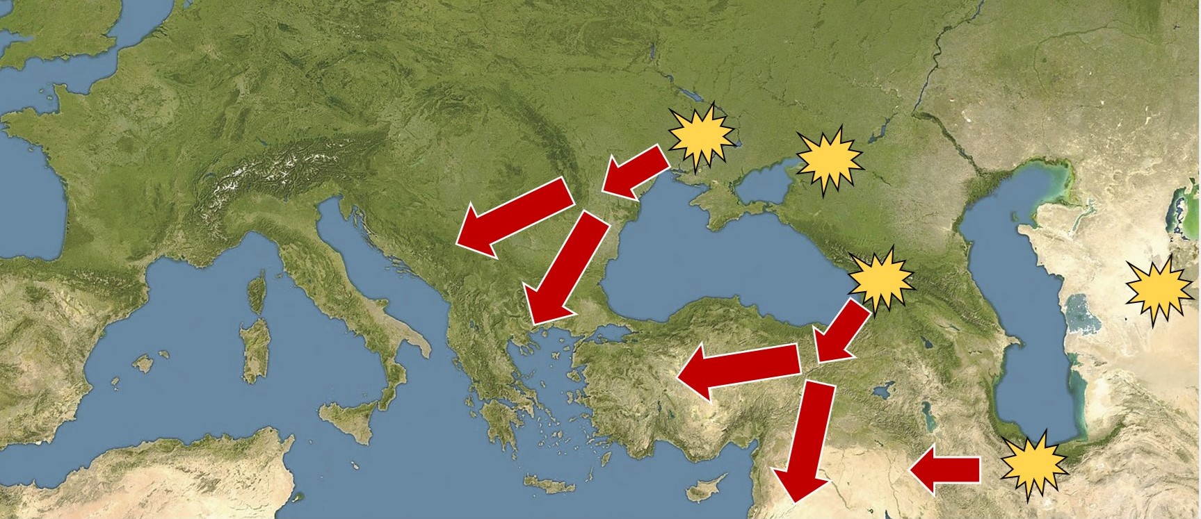 Fig 1: References of Tropilaelaps (yellow) and possible direction of spread (red). Simplified map [19].