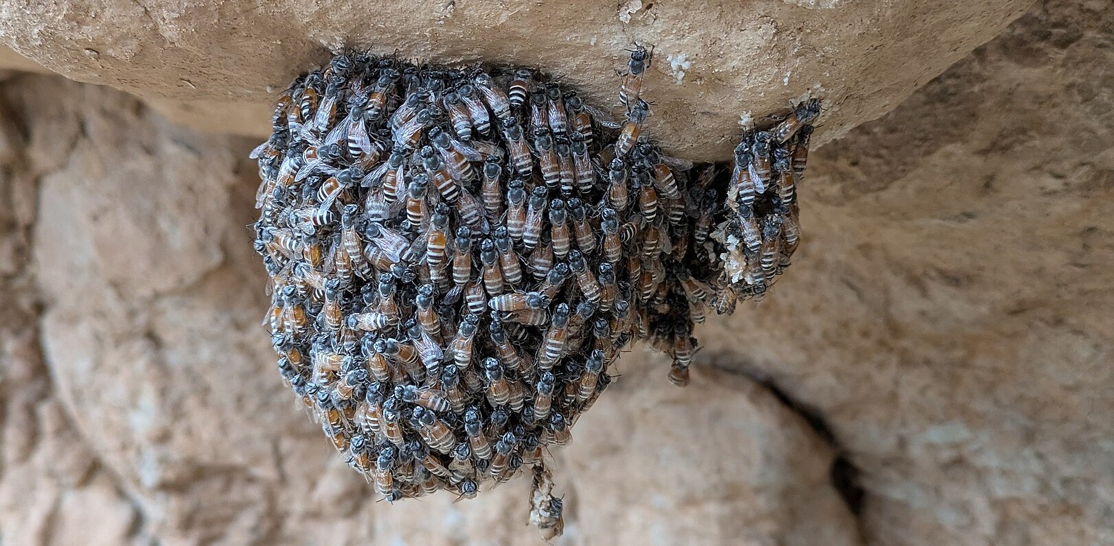 Image 3: Apis florea. This species usually nest around a shady branch in which they built a signle comb, but in a way they can perceive the position of the sun. Here they nest under the shade of a rock. [8]