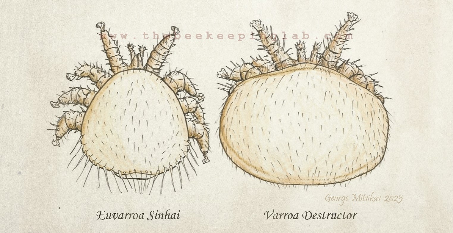 E. sinhai was first described in the international literature in 1974 by Mercedes Delfinado and Edward Baker, a couple of entomologists/acarologists. Females measure approximately 1.0 × 1.0 mm—about half the size of Varroa—with a densely hairy dorsal side and distinctive “whip-like” setae [2], [4]. Both Varroa and Euvarroa belong to the family Varroidae. The specific epithet sinhai honors Indian entomologist Ranendra Sinha [3].